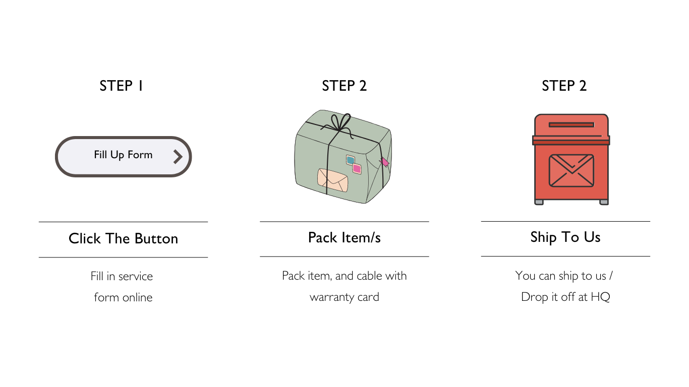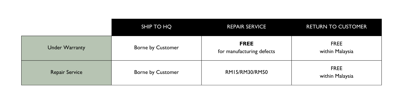 - When warranty or repair is completed, we will deliver back to your place. No return delivery charge is needed within Malaysia.
